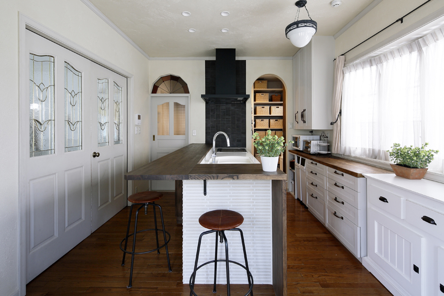 築23年の埃を払い ご家族お気に入りのホワイトインテリアをより引立てる デザインのブラッシュアップにも取り組みました。DKは清純な白トーンに合わせて 温和な色合いのブラウン系オイルを木素材に塗装。 脇役には優雅なレリーフやアーチの鉄パーツのアクセント。 リユースを決めたトール本棚やナラ床材とも馴染みの良い 擦れた古材や渋みを帯びたタイルを加えて力強さをプラス。 カッチリしすぎず少しくだけたパリ気風を感じるインテリアです。