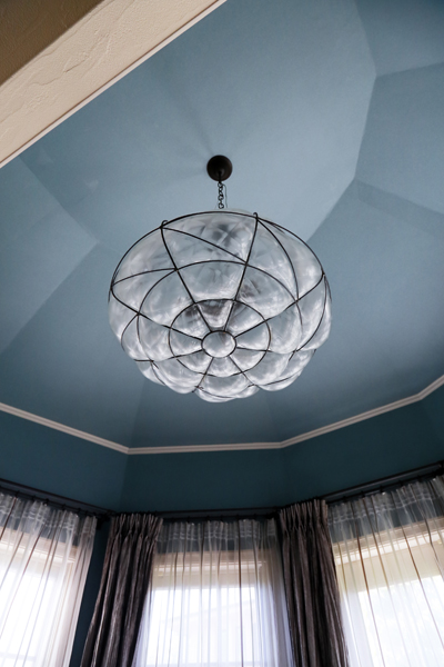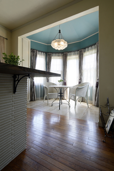 新しく誕生した 機能空間“ユーティリティ”ルームは 独立した家事スペースです。 大きな収納棚を持つ室内には 室内物干しやアイロン仕事も楽ラクできるテーブルを用意しました。 趣味にも使える十分な広さになっています。もう1室は 静謐なひとときを過ごすリラックス空間 “NOOK(ノック)”。 落ち着いたマリンブルーの天井に シャンデリアのふっくらしたフォルムが上品に調和した エレガンスなフレンチインテリアの室内観です。