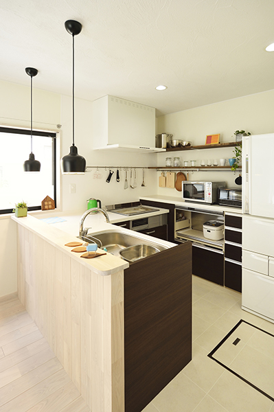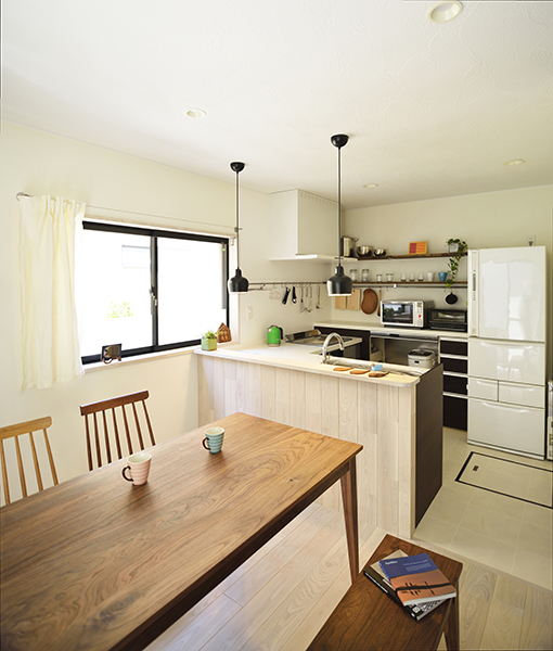 M様のご要望をふまえ、日常生活の中で「家族のつながりを育み、お子様が楽しくなる」をテーマにプランニング。家族の時間のほとんどを過ごすLDK。L型で見通しの悪かったLDは、和室を取り込み、閉鎖的だったキッチンをダイニング側に移動してL型の開放的な対面式にすることで、オープンなLDKを実現。どこにいても、お子様や家族とコミュニケーションが取れます。
