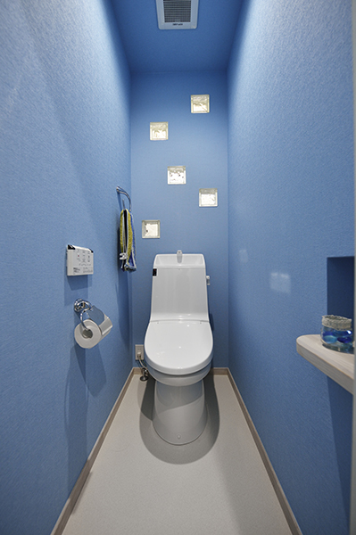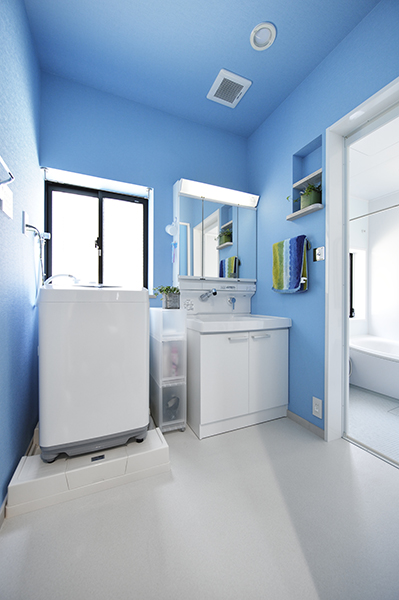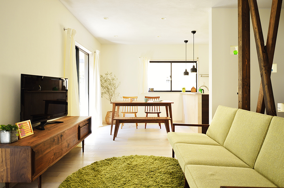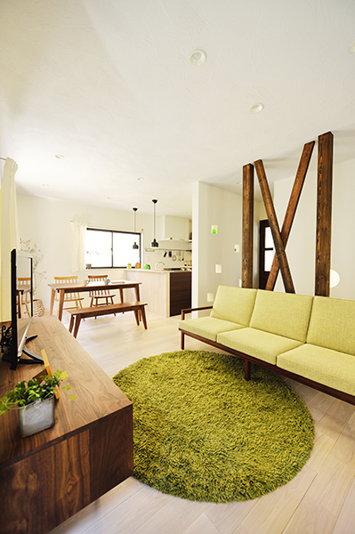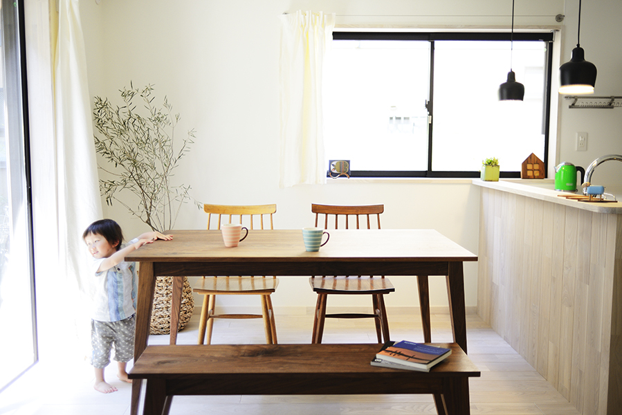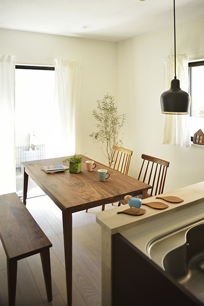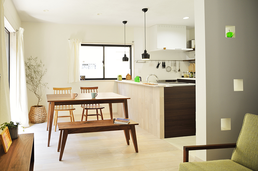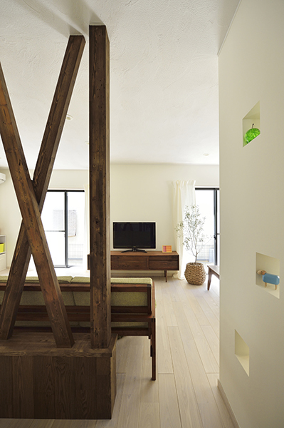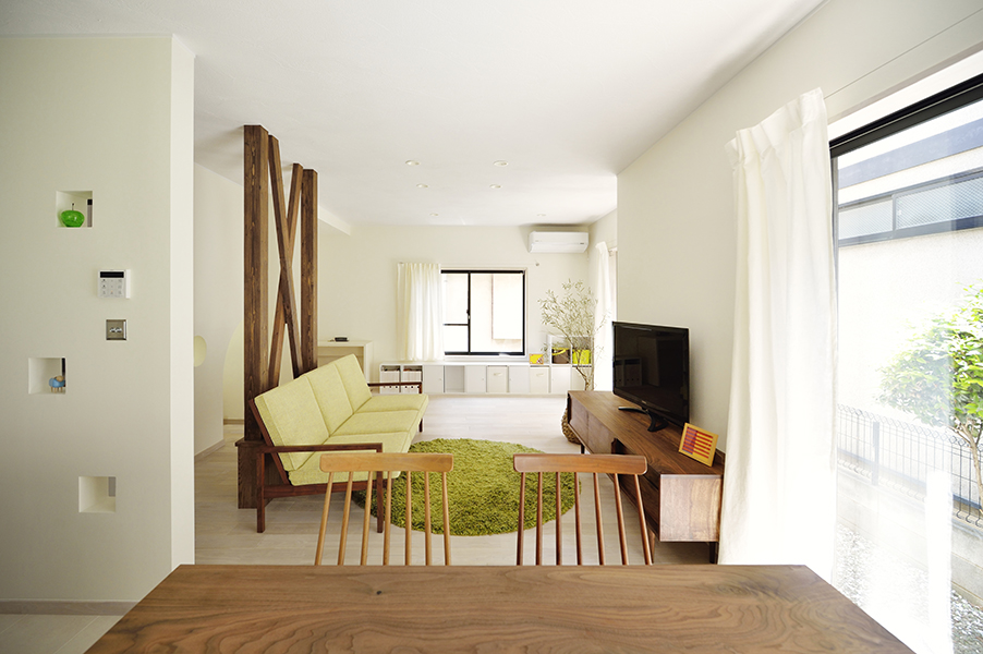 白い壁や、明るく塗装された無垢アッシュ材の床、ナチュラルなインテリアで、シンプルながら温もりある空間にデザインされたLDK。構造上必要な柱や筋交いは、そのまま活かして空間のアクセントに。また、壁の“□”や“〇”は、視線が抜けて空間に広がりを見せるとともに、遊び心を感じられる楽しい仕掛けです。天井には調湿効果のある珪藻土など自然素材を採用し、お子さんも安心して過ごせます。ライフスタイルに合わせた間取りの変更や、デザイン。随所にちりばめたアイデアやお子様にも安心の自然素材を取り入れることで、家族みんなが楽しく過ごせるさわやかな住まいになりました。