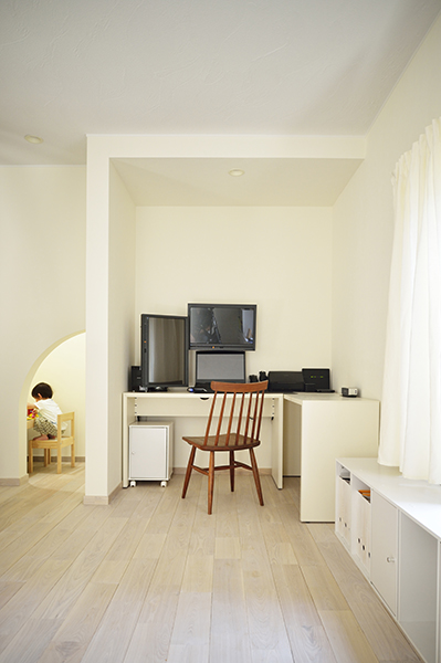 また、階段下のデッドスペースには小さな入り口を設け、1畳ほどの子ども部屋をご提案。絵を描いたり絵本を読んだりと、お子様も楽しそうに使っていただけています。その隣には、M様が自宅でもお仕事できるよう、書斎スペースを設けました。
