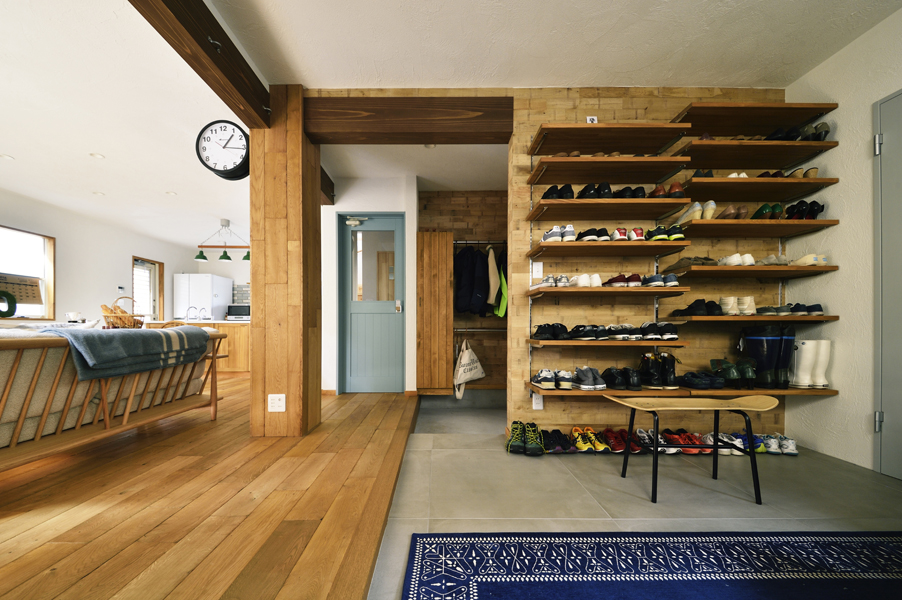 ご購入された築17年の物件が オリジナリティ溢れる 子育て空間に生まれ変わりました。大きな特徴は 玄関近くに造作した「シューズルーム」。 LDKから繋がる土間スペースに 靴・コレクションを飾るオープン棚を造作しました。 その景観はショップディスプレイさながら。 お気に入りが並ぶ姿は 広いLDKの一部に組み込まれ 素敵なインテリアになりました。