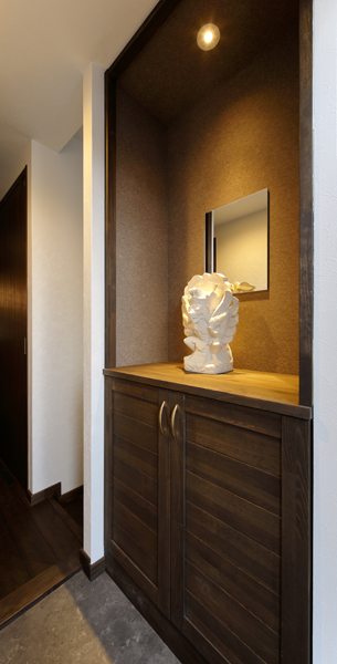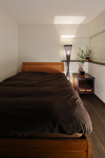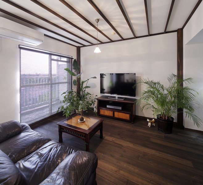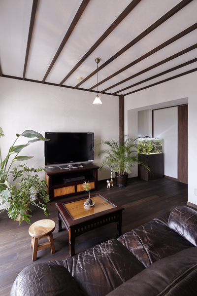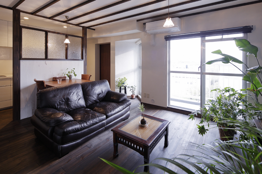 ラグジュアリーな「アジアンリゾート」の雰囲気が守られるよう 市販品を多く目にするキッチンは パーティションでLDと緩く分け 上手に生活感を隠しました。 大きな室内窓は空間のアクセントにもなり また視線が抜けることで室内がより広く感じます。天井には 上質感のある木材でストライプを造り 洗練された見ごたえを創りだしました。 床は全室で 踏み心地の柔らかい 無垢パイン材をご採用。 LDKや寝室には 珪藻土を用いて しっとりと温もりある風合いです。 ご旅行で滞在された南国バリ島に通じる 閑けさと癒しに満ちた 寛ぎのお住まいになりました。
