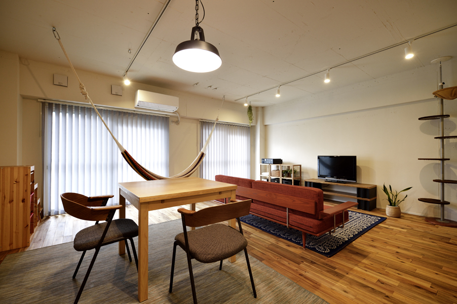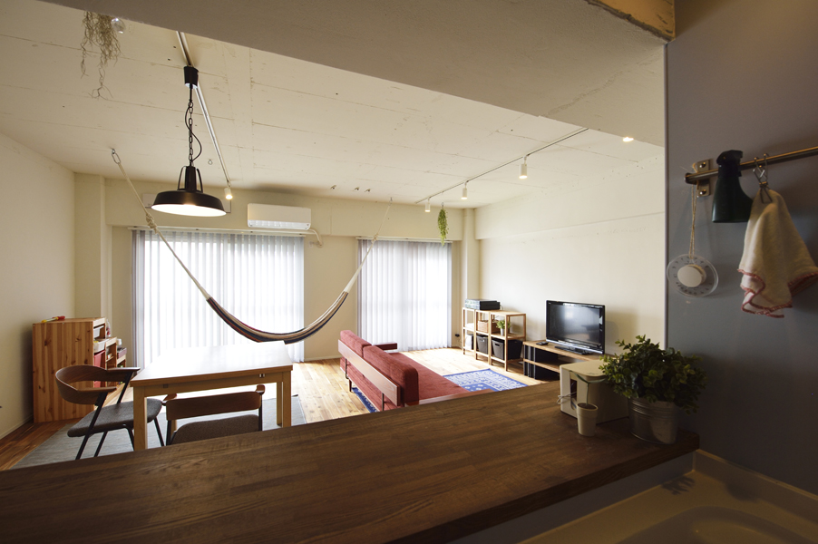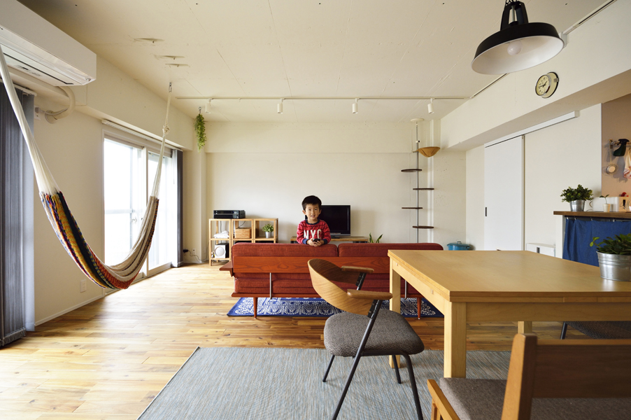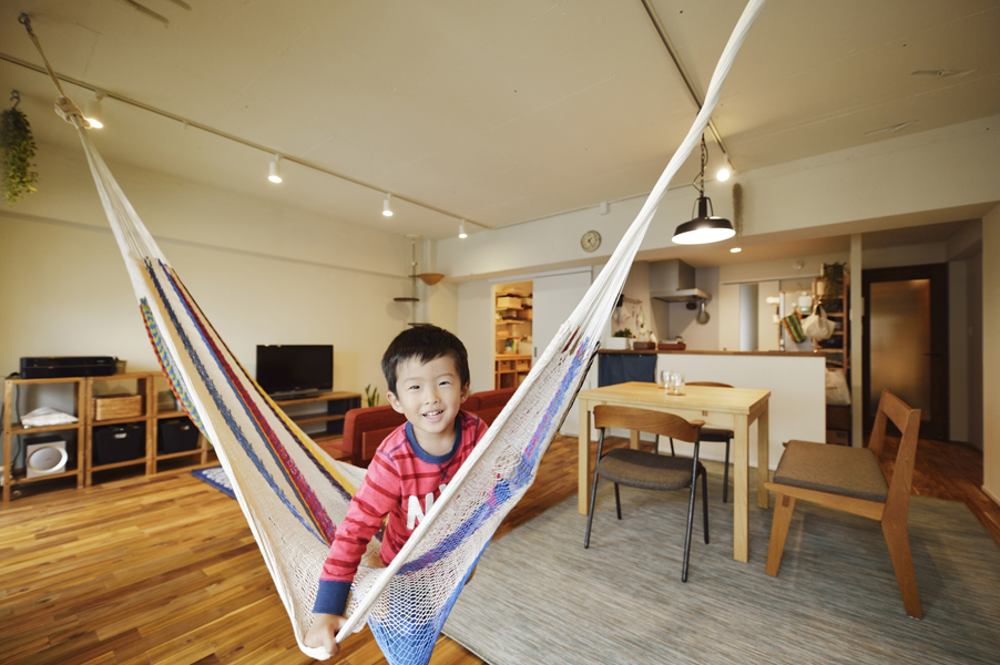 ハンモックやラフなフローリング、モルタルをイメージした土間や水廻りのグレーの床などで 好きなアウトドアのイメージを室内に取り込めたところや将来2分割できるベッドルームなど過不足無い空間が実現しました。 満足しています。