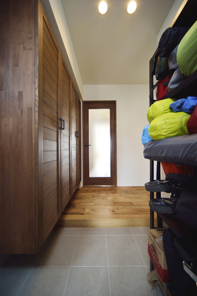 リビングから見えない場所には 生活に必要な品々を漏らさず収める収納スペースをご用意。 ご愛用のアウトドア・キャンプ用品は 土や水汚れに強い玄関土間が新しい居場所になりました。
