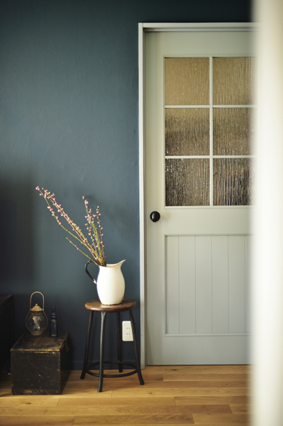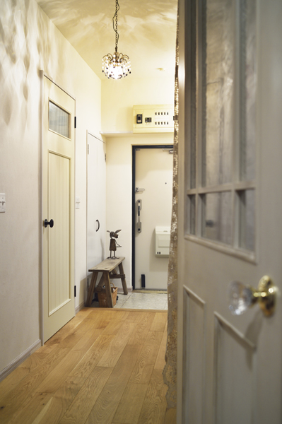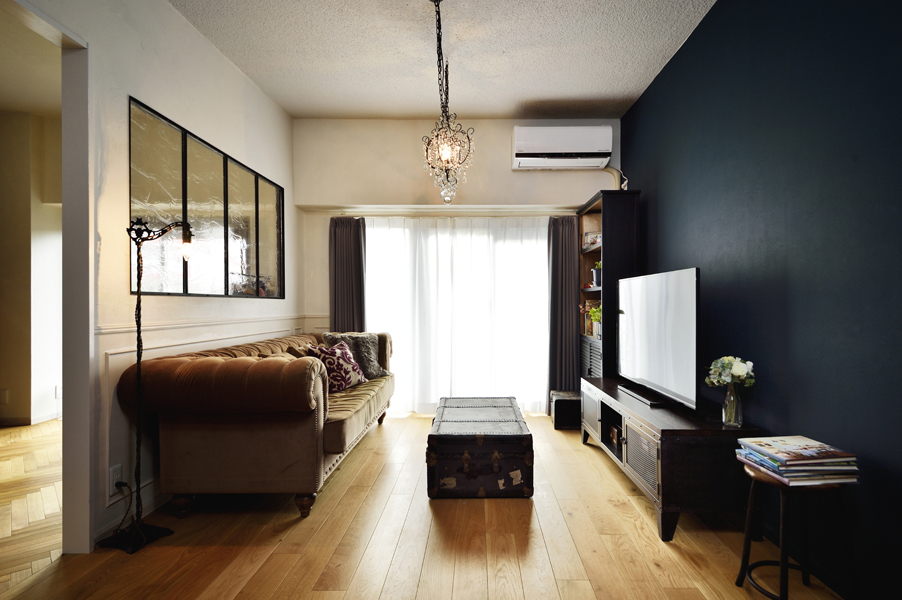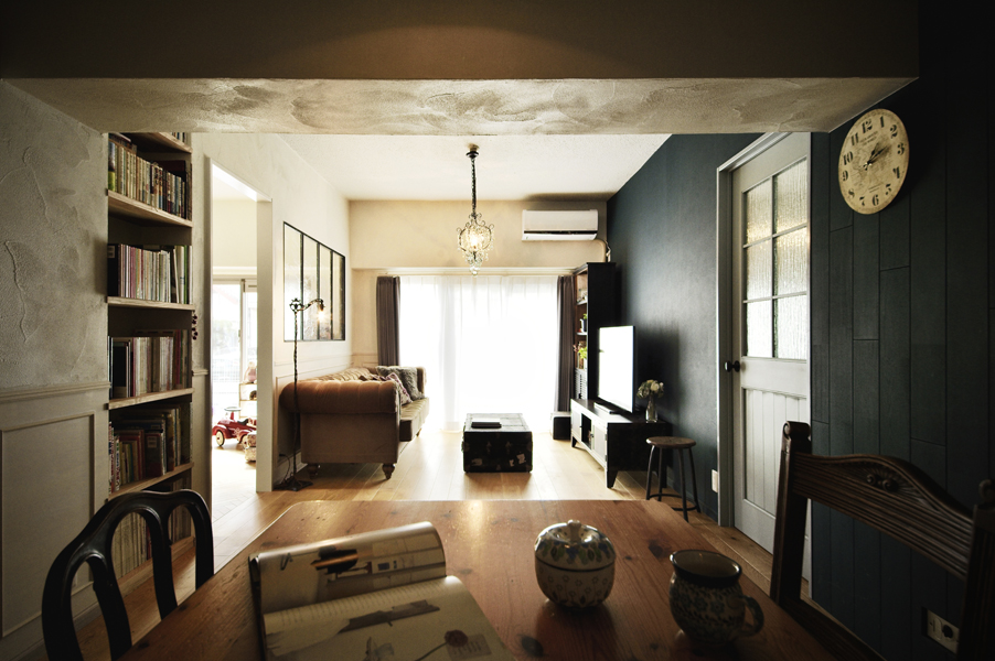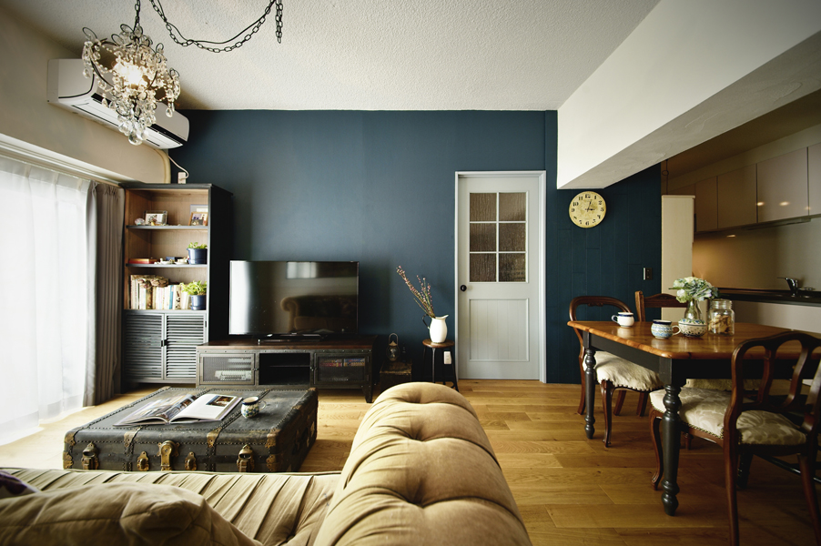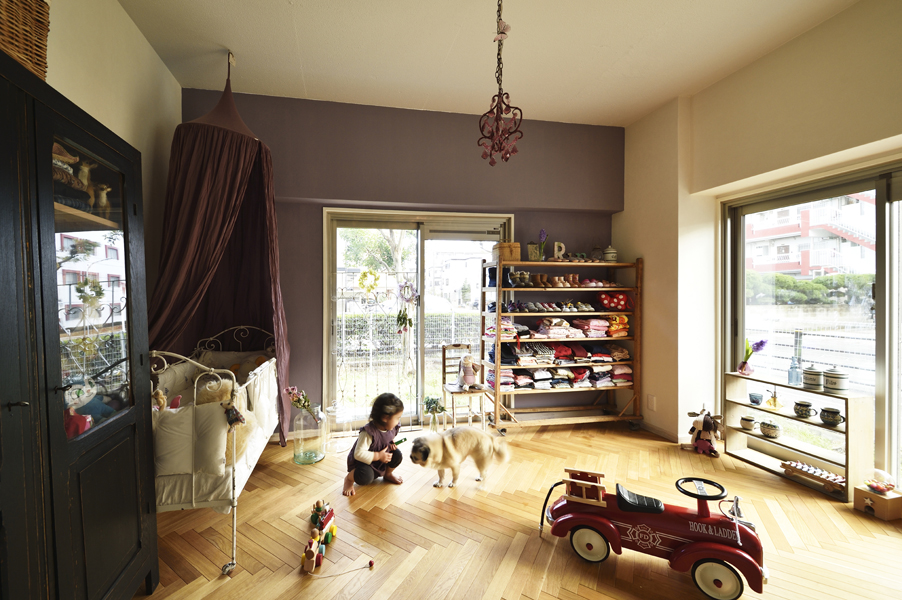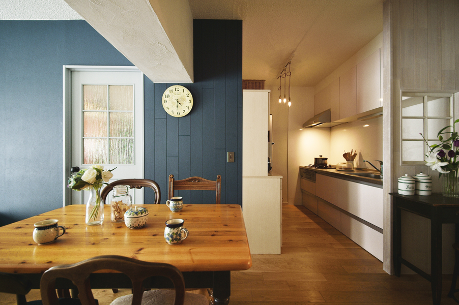 テーマの異なる室内デザインは 一般的に贅沢なプランと言われますが 『建具や室内の彩り方』の工夫で 印象をがらりと変えた 大人可愛い居室が 予算の範囲内でK様邸に幾つも誕生しました。 扉など建具には1点ものの造作扉を設置、床は部屋ごとに張り方を変えてイメージを刷新、室内観を左右するアクセントウォールはLDKはダークブルー 子ども室はパープルにして塗り分けるといった工夫が デザイン効果を上げています。リフォーム後の邸内は 格式高いアンティーク家具・雑貨とも見事に調和し クラシカルな雰囲気を醸す素晴らしい景観に。 個性的で優美な各個室が邸内の大きな見どころになりました。