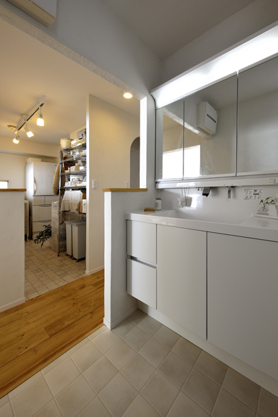 キッチン・ダイニング・リビングは既存と同じ位置関係ですが ピンポイントで壁を抜くことで 強度を損なうことなく 1つの大空間を造りました。キッチンから壁がなくなることで リビングとつながる動線が生まれ ぐるりと周囲を回遊できる開放的な明るいキッチンに変化!