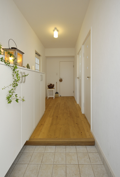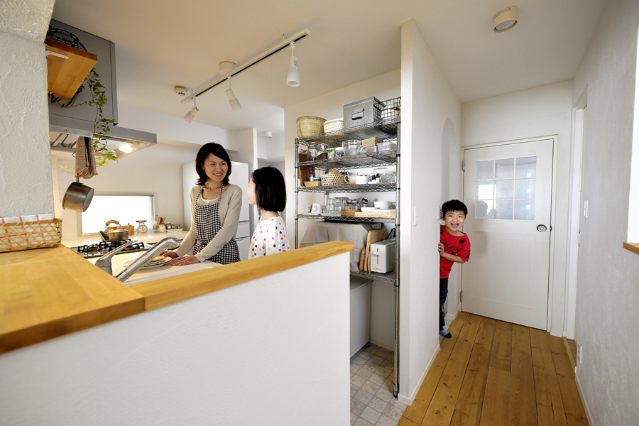 室内のデザインは 『もともと自然素材が好き』 というご夫婦に合わせた ナチュラルな装いです。 お手持ちの無垢材の家具や雑貨とも 素敵に馴染みました。 お子さまの「健康にも配慮したい」とご採用された 無垢パイン材・珪藻土で壁や床を施工したところ 実際に暮らし始めたご家族から 「無垢材の床は肌触りも気持ち良いし、空気も爽やかに感じます」との嬉しいお声が!暮らしやすさの面では 計画的に「収納」を新設。 キッチンにはパントリー・収納棚を造作するほか 洋室の一部をW.I.Cに変えて ご家族全員の服や道具、家電など様々な品物をスッキリと納めました。