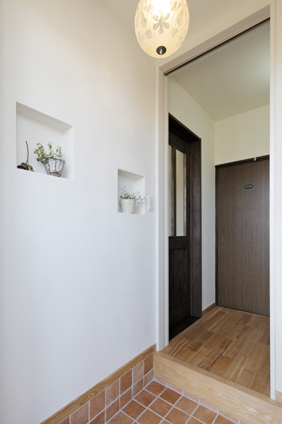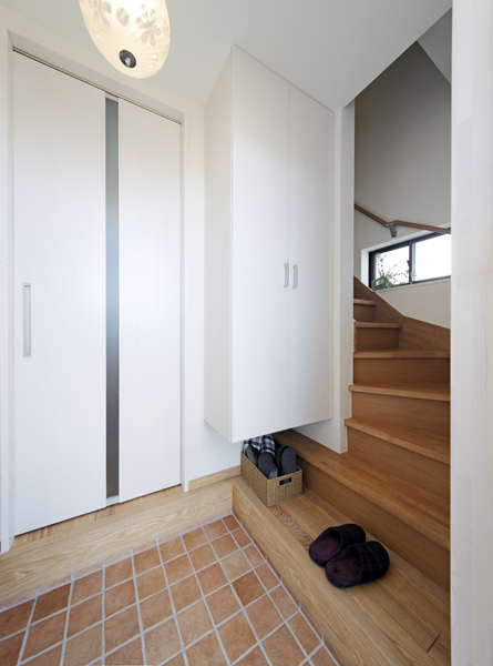 玄関は既存のものを両世帯が共有して使うことに。 共有玄関の場合「親(子)世帯の生活空間を通らないと自分の部屋に行けない」「親(子)世帯のリビング近くの廊下を通るので騒がせてしまう」と心配になりがちですが U様邸では 玄関からすぐに子世帯・親世帯に分かれて入る動線を新設し それぞれの世帯を煩わせることなく 自分たちの生活フロアに真っすぐに入れるよう工夫しました。 子世帯へは玄関に具えた新しい階段から 親世帯へは目隠しに設けた吊り扉を通って入ります。自然素材でぬくもりある子世帯と室温改善した親世帯
