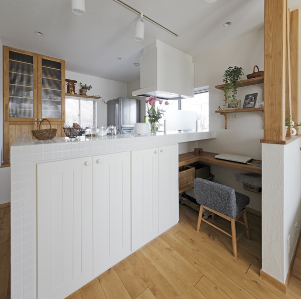 子世帯・2階フロアは 『せっかくリフォームするなら 自然素材を使いたい』 とLDKの壁は白い珪藻土 床材は温もりのある無垢パイン材(オーク色塗装)で施工しました。 自然素材ならではの優しい景観はもちろん 調湿作用にも優れて健康的です。 4面の窓から光や風がたっぷり届く遮蔽の少ないデザイン性もポイントのひとつ。 明るいLDKに 構造上必要な筋交い・柱が楽しいアクセントを加えています。キッチンには 優雅な白いキッチンが登場! 軽やかで清潔感ある白いタイルを周囲にあしらってお洒落な雰囲気です。 キッチンカウンターと間仕切りの間には家事の合間に一息つけるワークスペースが完成しました。