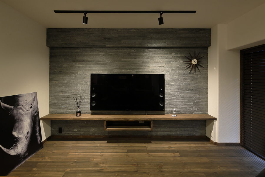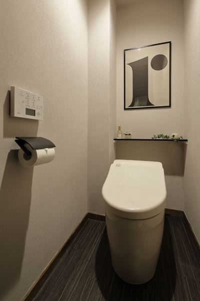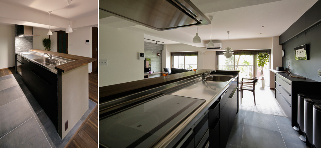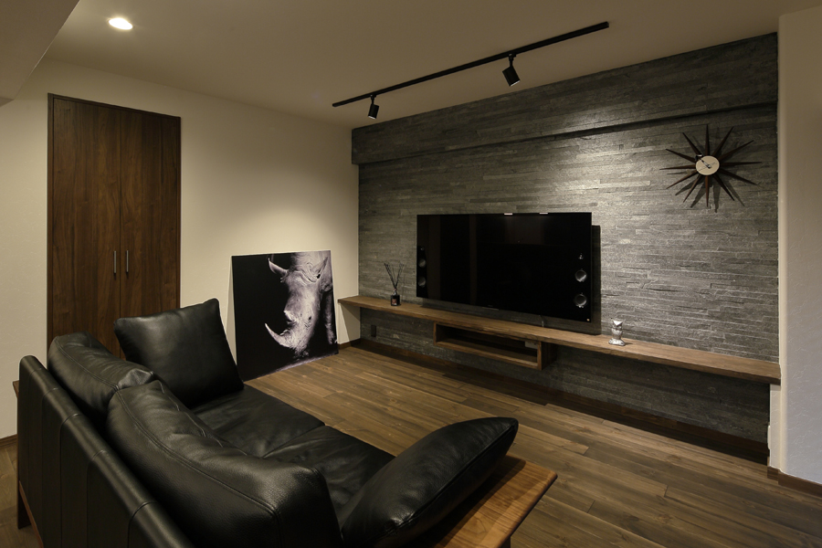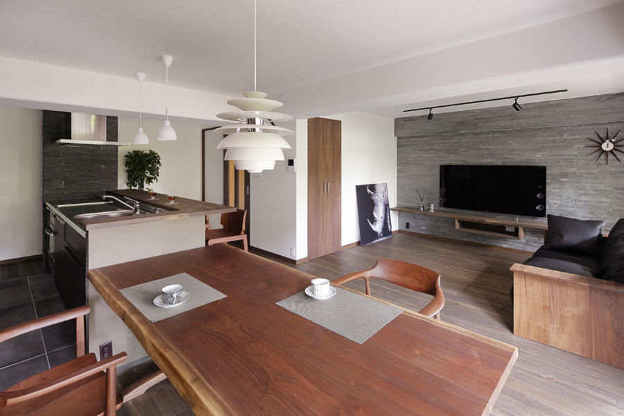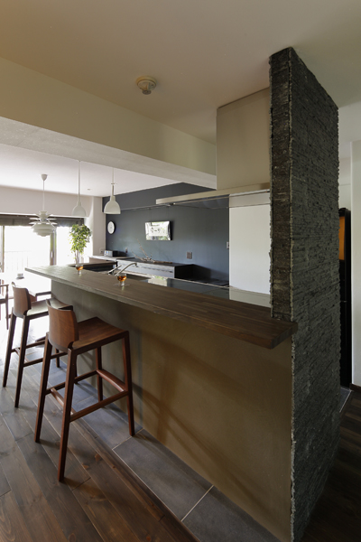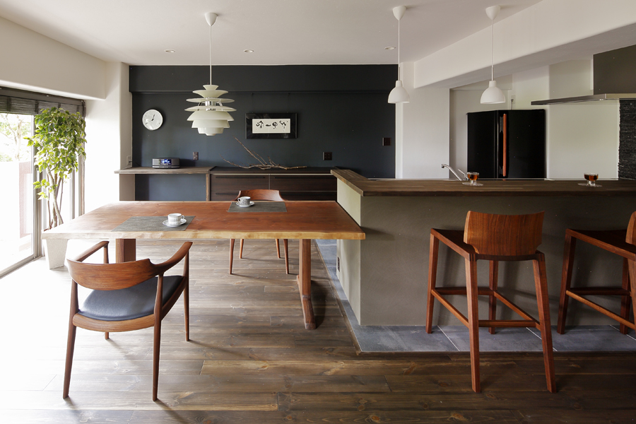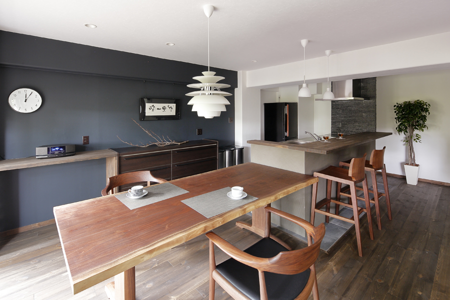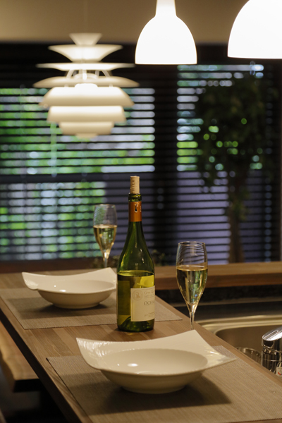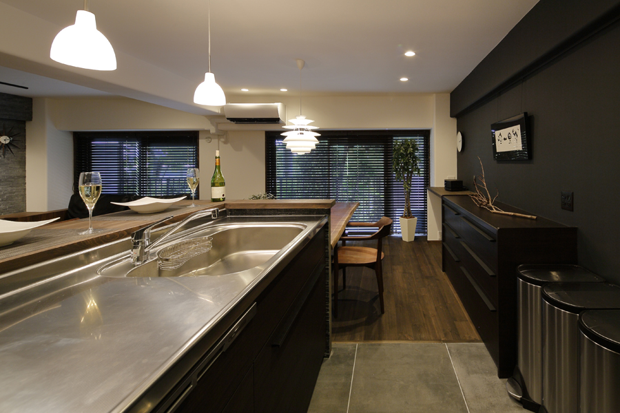 共働きのご夫婦にとってゆっくり過ごせる時間帯は「夜」。 心身をリフレッシュする 大人に似合うリッチでアーバンな空間を 個性的な照明と柔らかい室内光で彩りました。 穏やかな色合いに包まれるキッチンカウンターは洗練されたバーカウンターそのもの。 ご夫妻の新しい時間が理想の場所・理想の空間に実現しました。