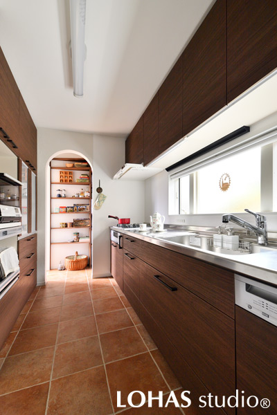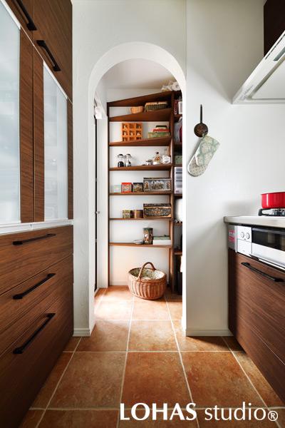 キッチンの奥にはパントリーを、LDにも壁面に収納スペースを造って、部屋にモノがあふれないようになりました。