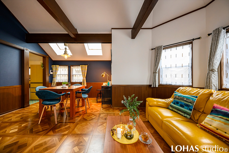 既存の梁と腰壁を活かしたリビングダイニングには、寄木細工が美しいパーケットフロアを張り、