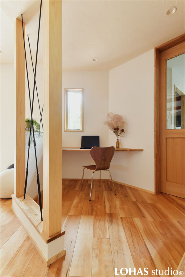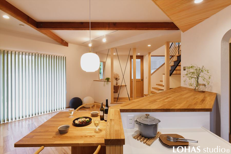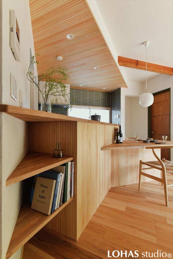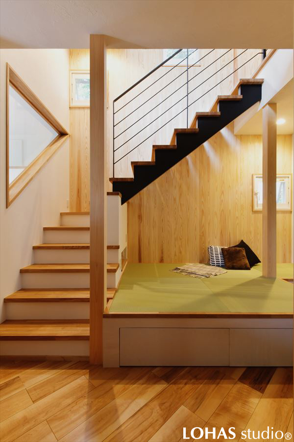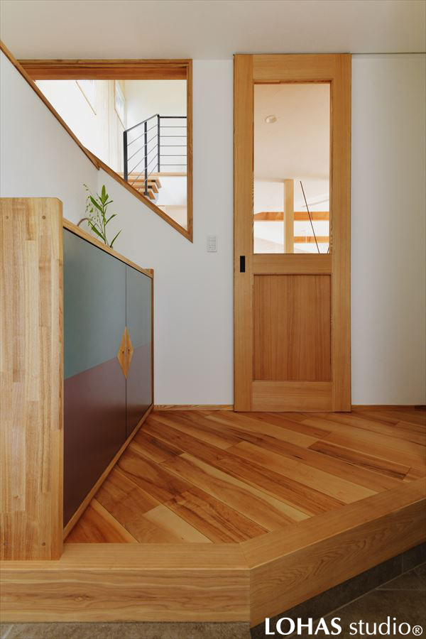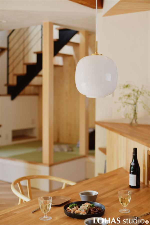 ご要望にあった階段の吹き抜けを実現させるために1階・2階と合わせて断熱の計画をし、耐震についても見直しをはかりました。地元、埼玉産の西川杉や自社プラントで製造しているセルロースファイバーなど、地産地消の素材も多用しています。