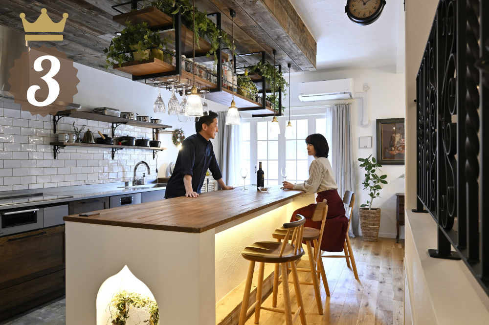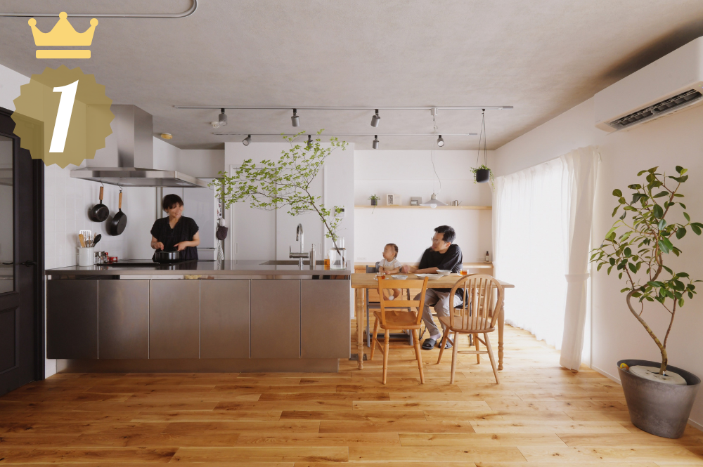 動線や収納、インテリアを見直し、新たに奥様の書斎やご主人のワークスペース兼趣味部屋を設け、高低差を活かすことで収納力もUP。 ご家族の憩いの場となった造作のアイランドカウンター兼ダイニングテーブルが特徴的な御家が優秀賞となりました。