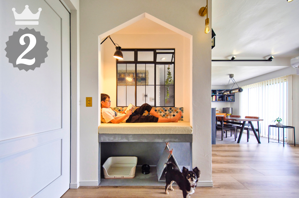 光がたっぷりと入る特別なヌックスペース。明るい空間を保ちながら読書や仮眠など、くつろぐことができます。 二階建てのような立体的なデザインで、下には愛犬の休憩スペースを。こだわりの空間が評価を集め優秀賞となりました。