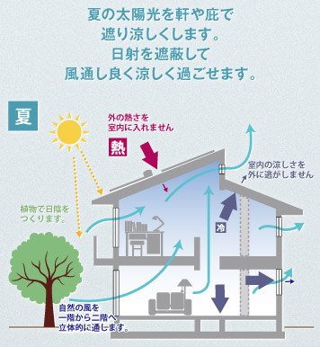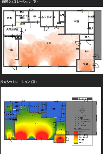 冬はどのくらい部屋に日が入ってくるのか?夏はどこからどれだけ風が吹いてくるのか?専用ソフトを使って光と風をシミュレーションすることで、より自然の力を活かした快適な住まいを実現します。各地域の日照・日射データ、気象データから季節ごとの光と風を調査し、専用CADを用いてシミュレーションを行い「光と風」の道をデザインします。