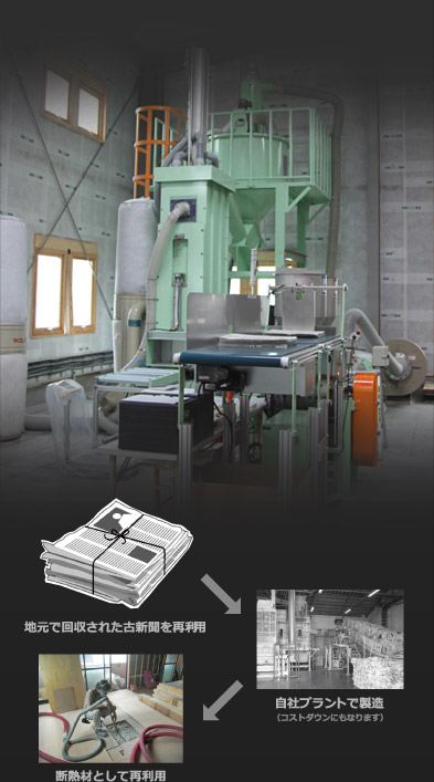 セルロースファイバーは、新聞古紙を粉砕して製造されたエコロジーな断熱材。断熱性はもちろん、調湿性、防音性、防燃性などの優れた特性も備え、自然素材との相性もよく、「断熱の王様」とも呼ばれています。LOHAS Studioでは、製造・輸送エネルギーの削減のため、地元の不要な新聞紙を集め、自社プラントでセルロースファイバー製造しています。