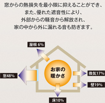 断熱性能で最も重要なポイントは窓です。サッシから逃げている熱は右図のように家全体の48%を占めています。