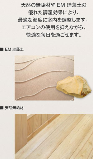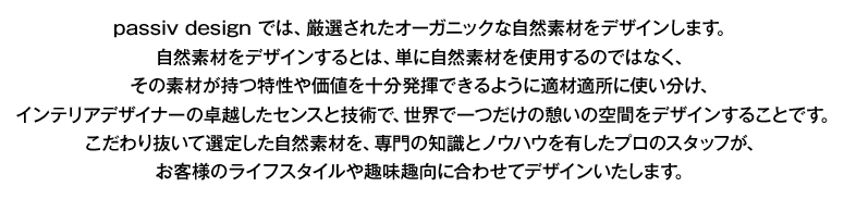 passiv designでは、地球環境やエネルギー資源、健康に配慮した自然素材を採用しています。EM珪藻土や天然無垢材など厳選した自然素材へのこだわりが、安全・安心で人にも地球にも優しい住空間づくりを実現します。