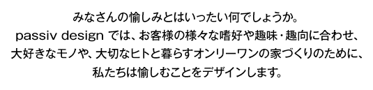 私たちはこの『愉しむをデザインする』と言う、お家づくりにとても重要な要素を加え、世界にひとつしかないオンリーワンのデザインを創造いたします。