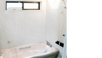 浴室にホワイトのマーブル柄の人工大理石を使用しました。明るい浴室にするため腰高の冊子の他に南側の上部にも、もう一か所サッシを取りつけました。