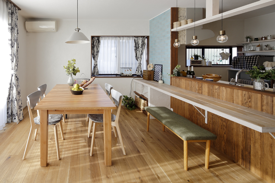 3世代が揃って心地よく暮らすために、タイルの天板を取り付けたカウンターキッチンを導入しました。