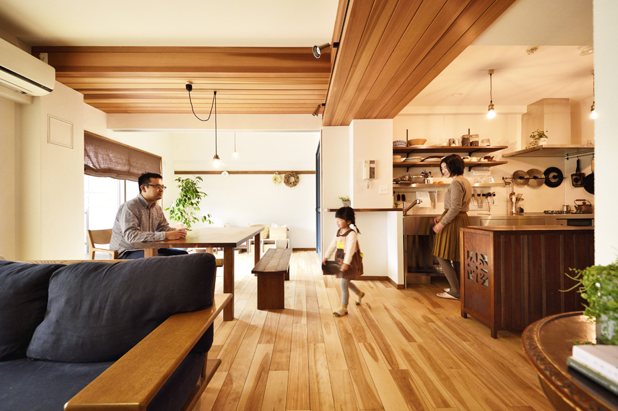 細部までお子さまの肌に優しい自然素材が中心のデザインです。ステンレス製をご採用されたキッチンには木製のオープン棚を造作して木の温もり感をプラス!