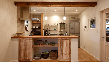 質感にこだわり、キッチンの上に設置した180年前の古材の梁は、手斧の跡がある圧倒的な存在感を持つ梁。床材の色も、造作の扉などもアンティークなテイスト生かしイメージをまとめています。