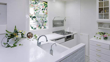 光が差し込む場所にバラのステンドグラスを設置。お料理の時間を楽しく過ごせる、奥様のお城が完成しました。