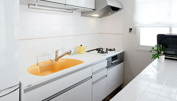 居室部分の白を基調とした爽やかなキッチンです。シンクのオレンジ色がアクセントになっています。