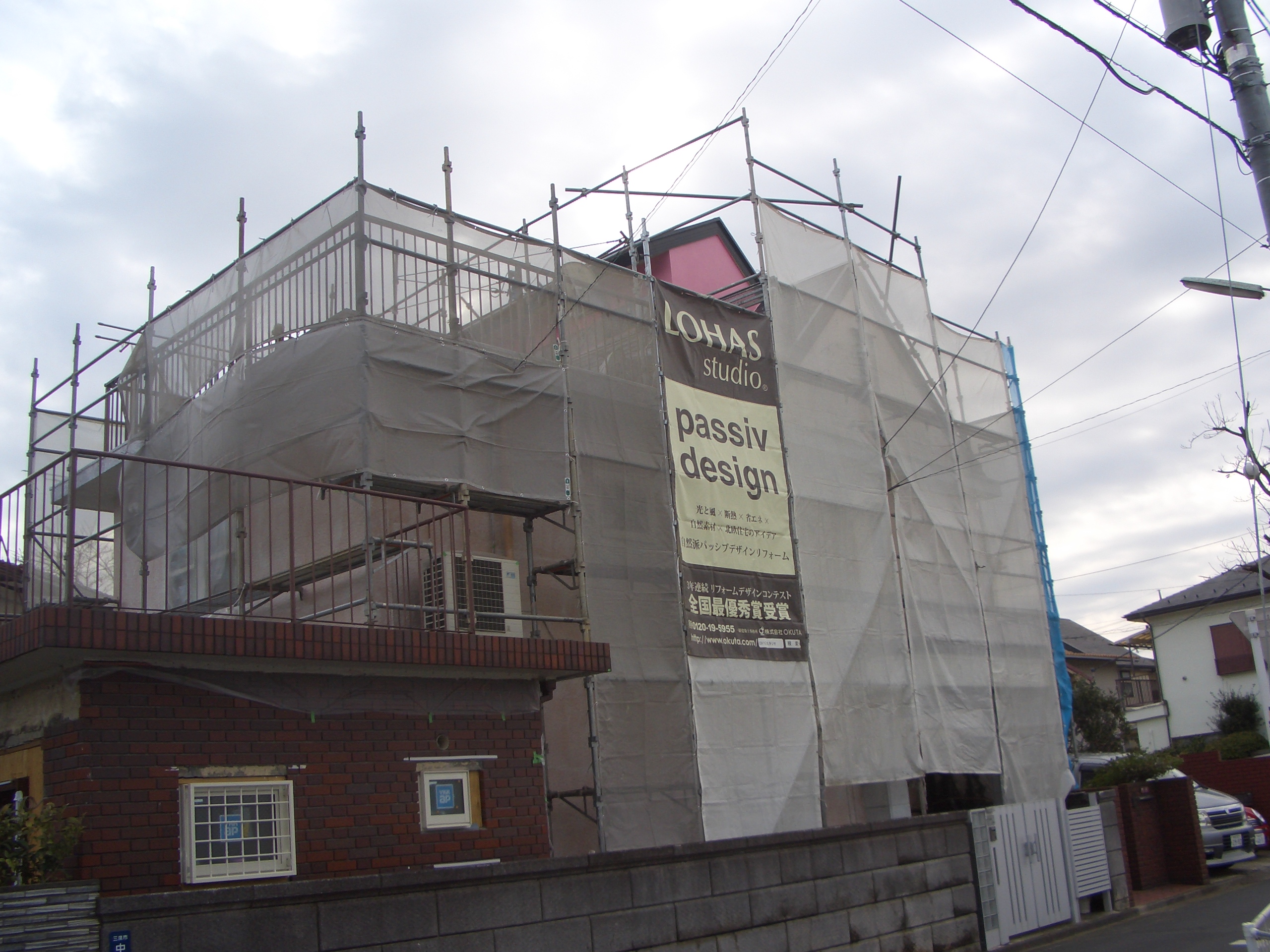 さらに、メッシュシートで建物全体を覆います。これは、周りの建物に外壁の塗料等が飛び散るのを防止するためです。