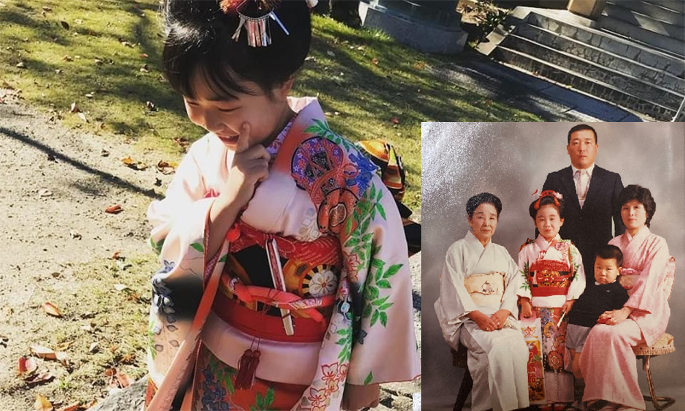 時を超えて七五三に、同じ藤娘の着物と髪飾りで。