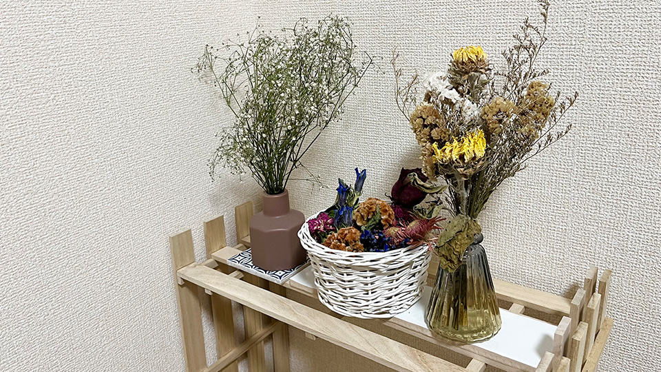 自宅には、お友達からいただいたお花をドライフラワーにして飾っています♩