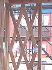 GVA工法は単なる制震工法ではなく、巨大地震で筋交いフレームが一定の変形が起きると、2枚の金物どうしがロックすることで、一転静的剛性を高めて、ほかの筋交いや耐久壁などと協力しあい、それ以上の変形を抑制する安全設計が施されています。