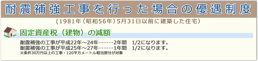 30万円以上の費用をかけて耐震補強を行った際に、その住宅の120平方メートル相当部分につき、固定資産税を減額するもの。たとえば、平成22年~平成24年に工事を行った場合は2年間固定資産税が1/2に減額します。詳しくは弊社耐震事業部までお問い合せ下さい。