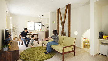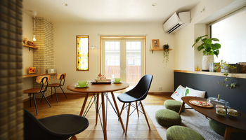 お子様の誕生をきっかけに、ライフスタイルにあった中古物件を購入しリノベーション。壁に□や○の穴を空けることで空間に広がりを見せるとともに、遊び心を演出しました。