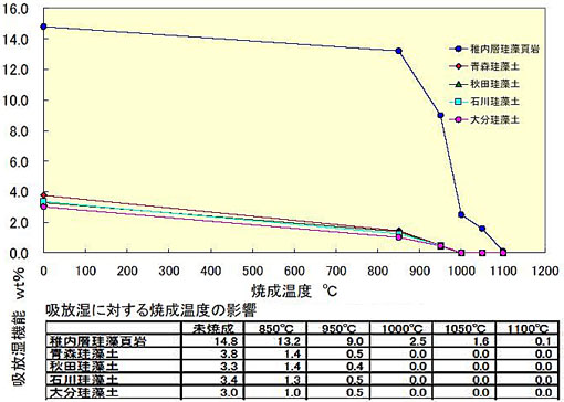 多くの珪藻土メーカーは800度から1200度で焼成を掛けているそうですが、上記のグラフを見てもわかる通り、焼成をかける温度が800度を超えたあたりから徐々に調湿効果が落ちていき、1200度でほぼ調湿効果がなくなってしまうというデータも出ています。
